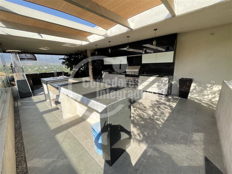 Gran quincho equipado completo, parrilla a gas, refrigerador, horno, isla, amplia terraza con cortinas glasstech,
